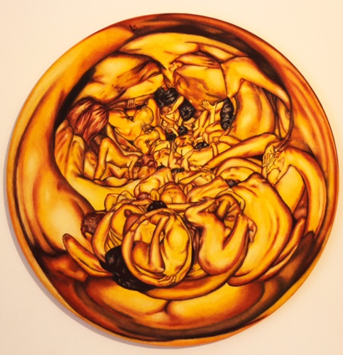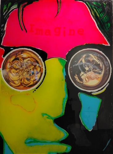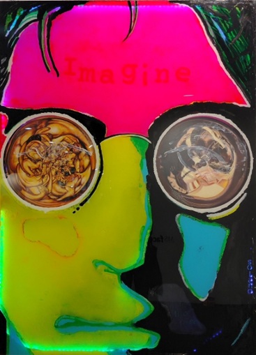 Acrilico, smalto su plexiglas in legno sagomato, tele tonde D 40 cm, motori rotanti, LED UV 150 x 110 cm 10 Novembre 2025